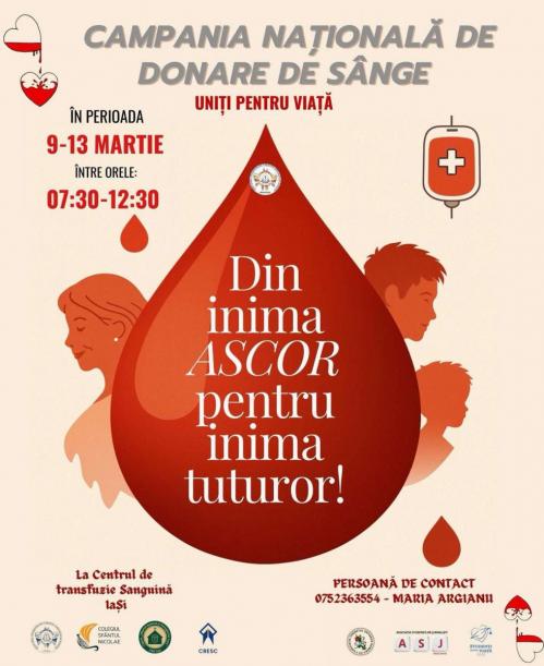 În perioada 9-13 martie, între orele 7.30 și 12.30, se va desfășura campania națională de donare de sânge „Uniți pentru viață”. Evenimentul este organizat de Asociația Studenților Creștini Ortodocși Români – Filiala Iași, Colegiul Sfântul Nicolae, Asociația Studenților Jurnaliști, Departamentul Minorități, Capela UMF și Studenți pentru Viață Iași. Activitatea va avea loc la Centrul de Transfuzie Sanguină din Iași. Campania se adresează studenților și publicului larg.